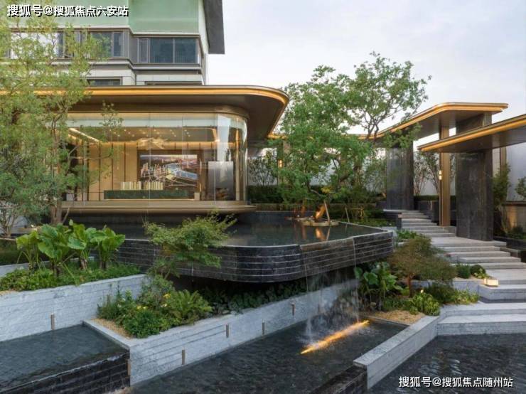 由青松指引,自景墙两侧进入内庭。景墙背后水幕潺潺而下,冲淡城市的喧嚣,沉淀出一方静候空间;经由艺术铜门进入园内,展现门庭礼仪。