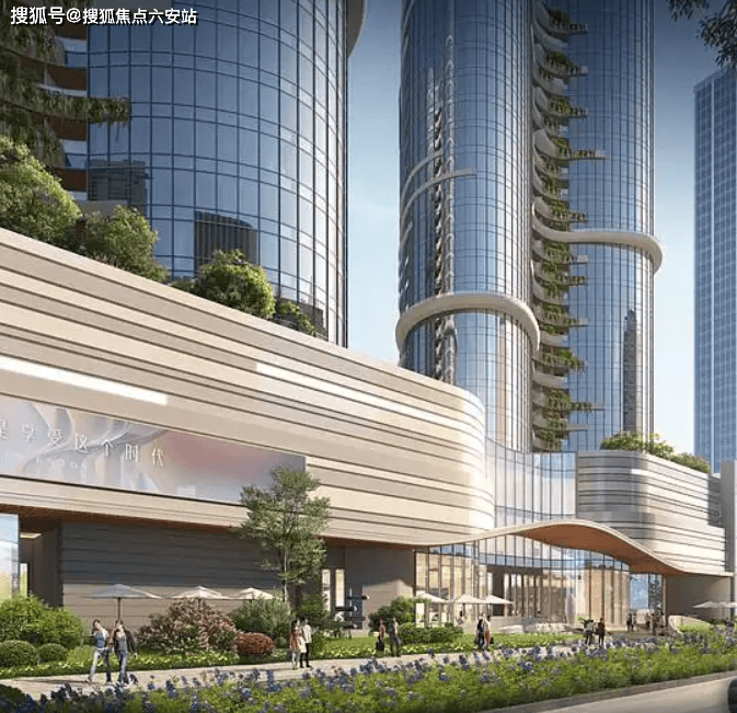 垂直生态体系:裙房屋顶花园与入口景观打造“双花园”,以钱塘江浪潮、西湖茶田为灵感,形成城市中的桃源绿谷。