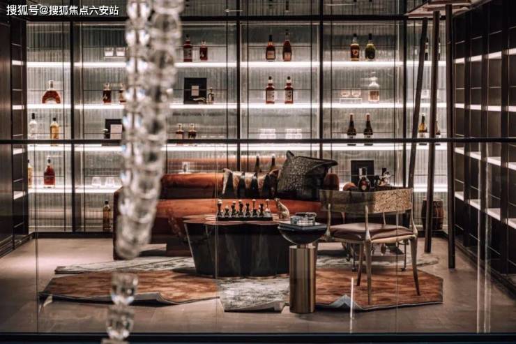 从静心凝神的茶室走几步,就到了藏酒饮酒的开放式会客空间,墙上橱柜码着主人从各处精心搜罗回来的上等佳酿。