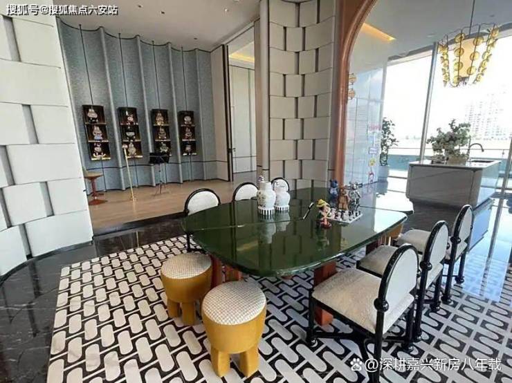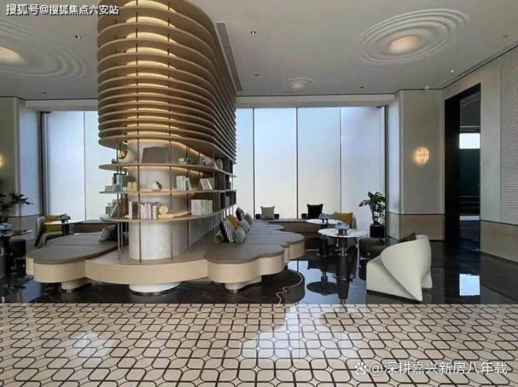 架空层空间也很丰富。7号楼架空层不仅有艺术走廊,还有独立书吧、休闲区等,往外看去就是绿植和蓝色景观水池。
