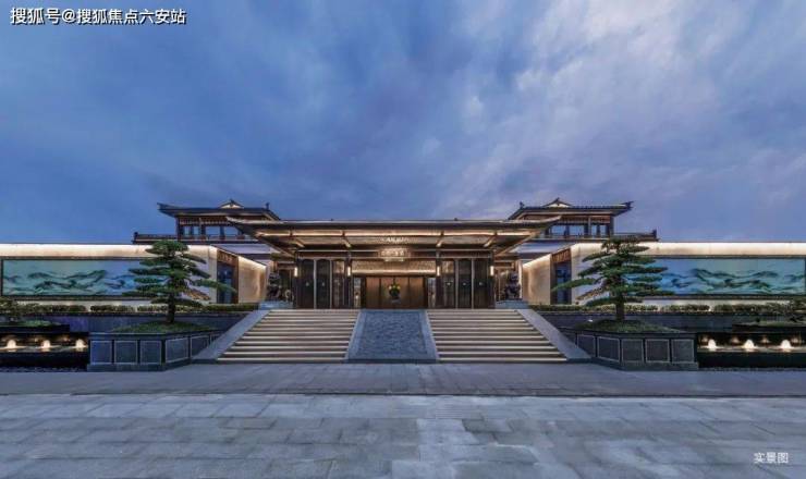 宋风美学建筑:外立面采用伊朗进口“蓝眼睛”石材与香槟金铝板,融合歇山顶、戗角飞檐、青石地雕等宋代建筑元素,展现东方哲学中的“天地人”和谐共生。