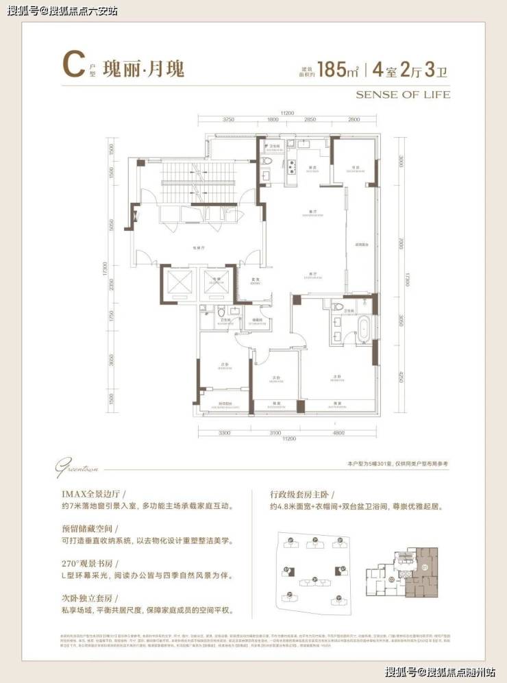 建面约185㎡则升格成行政级主卧套房、270°观景书房以及独立储藏间等功能,为未来十年的改善生活留足弹性。