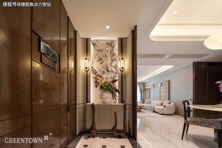 杭州丽香庭还打造了杭州高层住宅间难得一见的“琉光环岛”车马厅,泥客石、艺术玻璃与光影辉映,艺术品雕塑居中点睛,矜贵尽显。