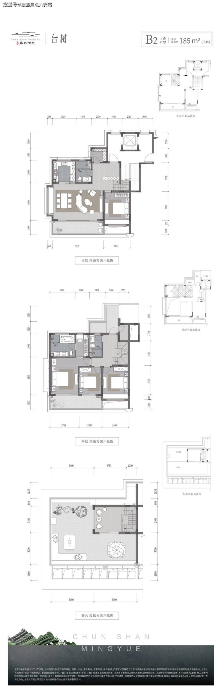 上叠:155-185㎡户型,赠送60㎡星空露台,5.6米挑高地下室可改造影音室或酒窖。