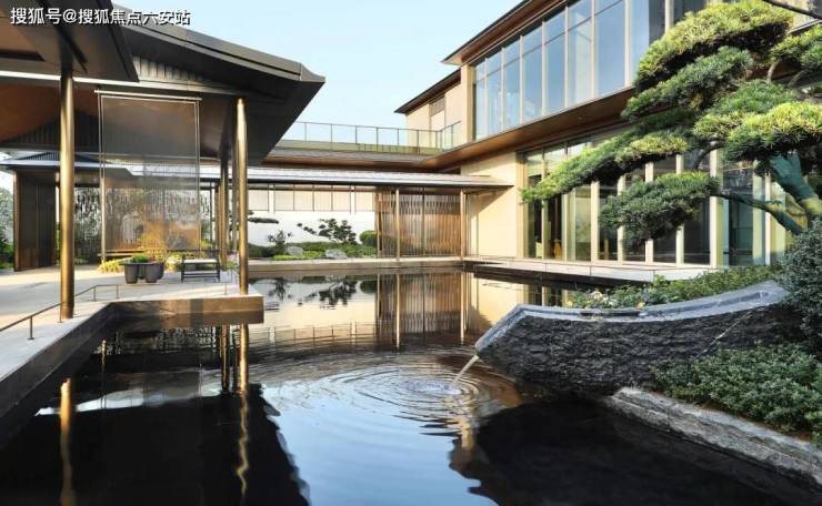 建筑外观也特别对胃口——没有传统中式的厚重感,而是以现代手法演绎宋韵美学。排屋、叠排一层采用有质感的石材外立面,雨天沾着雨珠,亮得温润;二层以上用金色勾边,古铜色檐口在阳光下泛着暖意,显贵却不张扬。大面积玻璃窗户更让景致入户,坐在客厅里,窗外的河景、园景尽收眼底,室内愈发亮堂通透。