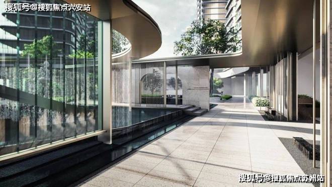 沿着风雨连廊穿过景观园区,不经意间遇见汀水会客厅,叠水石景、游鱼锦鲤,让人在游览中陷入片刻的微醺。就在这连廊中轴水月观景区,可直接观赏整个园区风景。