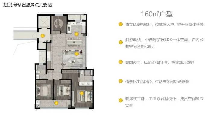 270°环幕江景:东南朝向布局,部分户型享270°转角阳台,推窗见江、闭目听涛。