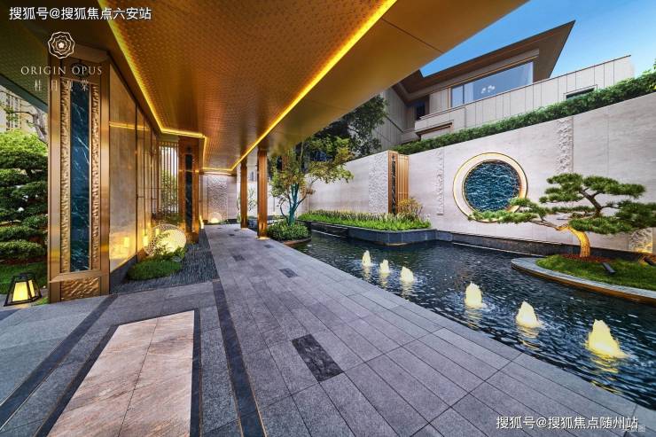 项目入口处匠心独运,中心满月景观墙采用高定液态大理石,门庭入口两侧打造凯撒灰、普拉达绿奢石景墙。入户两侧水景清泉涌动,婉转迂回,透过门框衬映出满月景墙,在虚实掩映间延续着东方诗意山水的写意画卷。