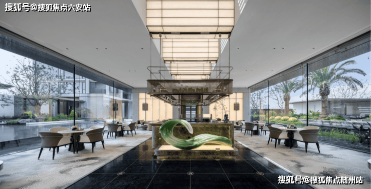 首先,大门前有“聚水生财”的雕塑喷泉,主入口有数米高的景观石墙瀑布,沿着大门旁边的游廊前行,穿过归家大堂和风雨连廊,看到的是约430㎡的镜面中央水院,围绕水景还设置有下沉式卡座、幽廊听晚等会客厅,给人以庄重大气之美。