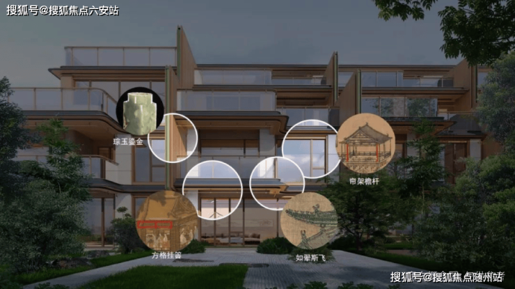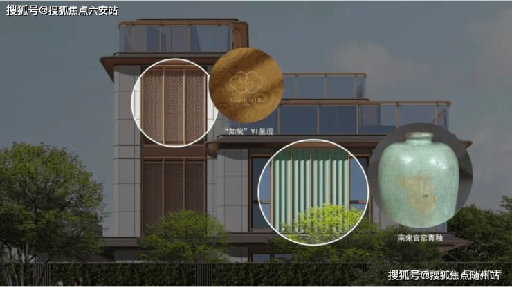在建筑上,如玺华院以天青色陶板,致敬杭州的宋韵文化,演绎“雨过天青云破处”的意境;观锦宸樾府用伊朗红洞石,唤起当地人对临安鸡血石文化的情感共鸣,呼应“鸡血一滴避邪气,得此宝贝最吉祥”的民间佳话;运河樾用蓝色景泰蓝搭配弧形陶板,再现运河的波光,诠释“春来江水绿如蓝”的江南意境。