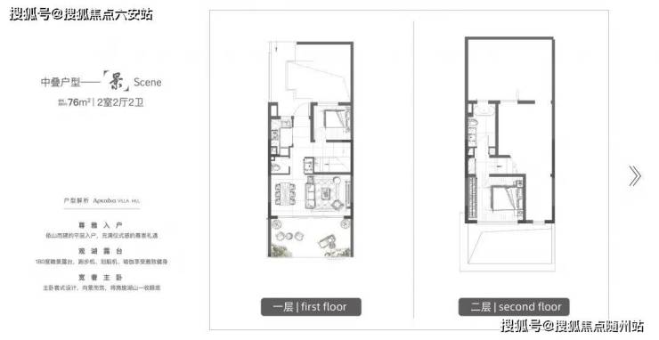 建面约81m²两室一厅一卫上叠,打造湖景客厅、主卧,以及可变空间,将实用度与舒适感平衡得恰到好处,亦设计有屋顶露台,是众多度假型、艺术工作者的心动选项;建面约76m²两室两厅两卫中叠,打造主卧套房,安静私密,并带有花园露台,带来舒适颐养的生活方式,非常适合老年客户居住。