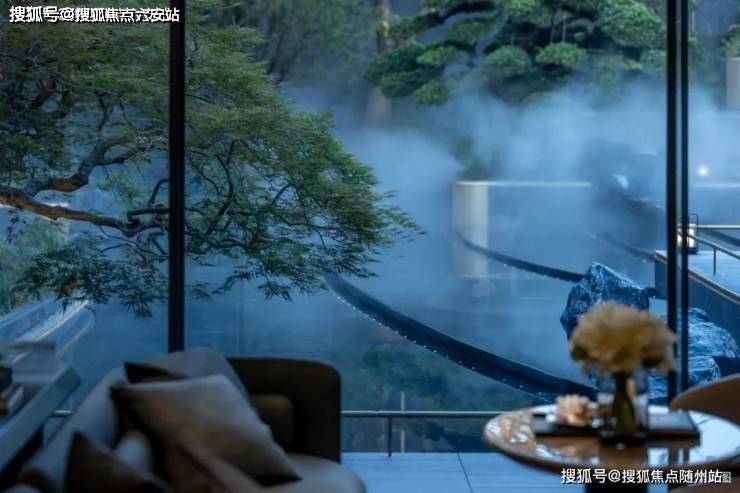 项目以《千里江山图》为灵感,将宋代园林的“深远”意境融入现代建筑,入口处黑金砂石铺就的“山岚”意境伴随流瀑蜿蜒,宛如宋画中的山水长卷徐徐展开,园中两株珍稀罗汉松冠盖如云。