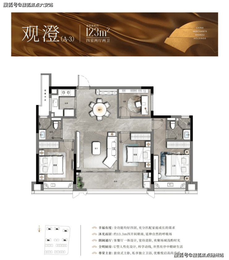 以中间套为例,建面约123㎡的户型做到了主次卧+客厅四开间朝南,伸展开约13.3米的超大面宽,对应双开间阳台与飘窗的设计,进一步提升了全屋的采光。此外,一体化的餐客厅,“一镜到底”活动空间,在视觉上拉大了户型的朗阔尺度。