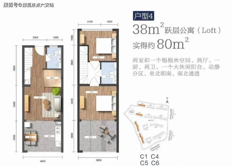 建筑面积38㎡跃层,实得面积约82㎡,两室两厅两卫,休闲大阳台,动静分区,坐北朝南,南北通透,硬装交付