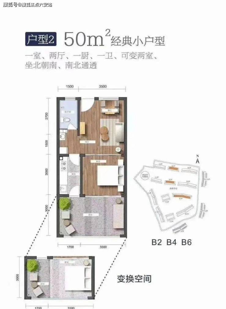 建筑面积51㎡,一室一厅一卫,可变换两室,坐北朝南,南北通透,硬装交付