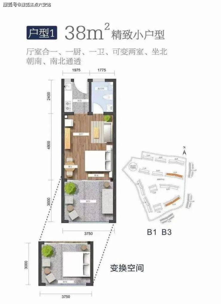 户型介绍:建筑面积38㎡,一室一卫,可变换两室,坐北朝南,南北通透,硬装交付
