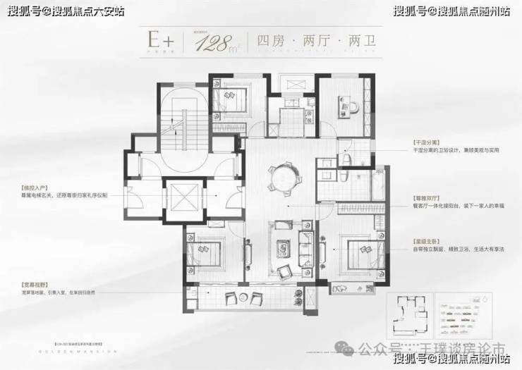 · 128㎡四房两卫:独立玄关+LDK一体化厅堂,主卧套房配置