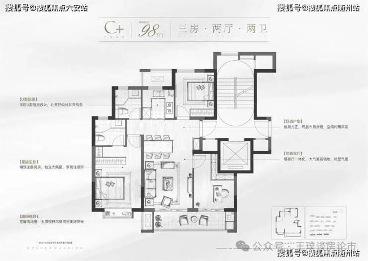 · 98㎡三房两厅:南向双阳台,U型厨房+干湿分离卫浴