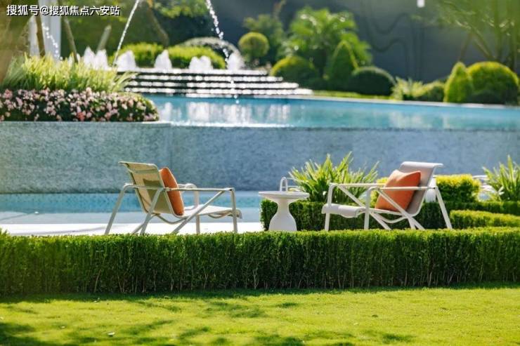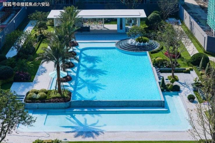 大量的玻璃幕墙+局部铝板等建筑元素的恰当组合,低密的纯洋房大盘在园区中央打造了颠覆性的“六翠之境”:目之所及是一片通透的蒂芙尼蓝,镜面泳池里波光粼粼,倒映着蓝天白云,是真正的“天空之镜”,与边上高大的棕榈树、白色的躺椅、繁茂的绿茵,彼此映衬,海边度假风油然而生。