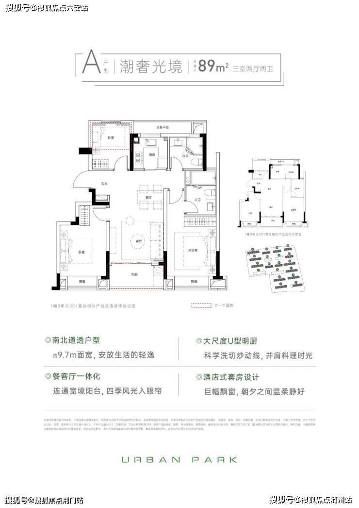 主力户型约 89㎡三房举例,即便最小的房间也能作为卧室使用,真正的大三房; 明厨双明卫,真正的全明设计; 三开间朝南,南向采光面长约9.7m; 主卧套房,含飘窗面积约20㎡,格局相当阔绰。