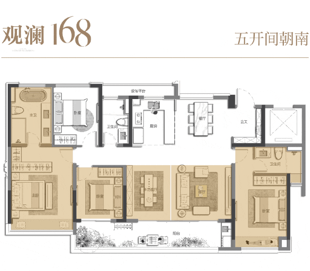 第三重惊喜来自户型的突破。大尺度的168平方米户型,竟然做到了五开间朝南,约17.6米超大面宽及阔尺阳台,而且实现了三个明卫。要知道,目前市场上同户型主流面宽都是15米多。