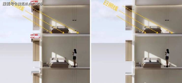 在满足结构、日照等情况下,合理推敲层间飞板尺寸及比例关系,强化流动感特色;凸显滨湖建筑轻盈灵动感。实现区域整体色彩的协调和变化;并根据日照系数计算进行三维模拟,南向采光面双飞板控制挑出结构面约150mm对室内无采光及视线遮挡。
