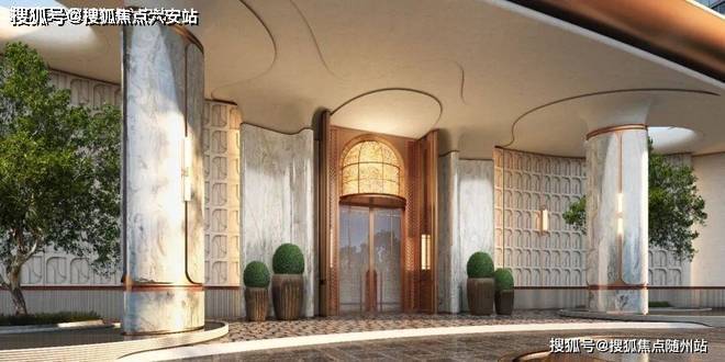 潮映杭园不惜重资打造千万级高奢门厅,汲取上海前滩华尔道夫酒店为设计灵感,大气打造约46米超长界面、约9米挑高巨幅门头。