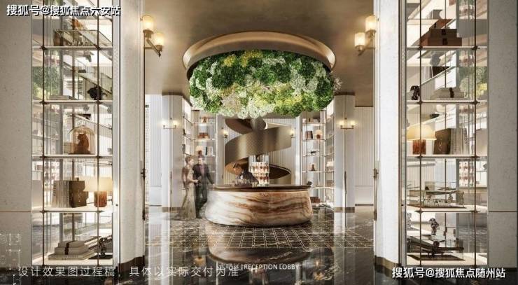 在动线设计上,项目打造了“三进式”归家礼序。北侧主入口设置环岛落客区,选用贝金米黄石材与古铜色金属大门,复刻高奢酒店仪式感;首层大堂以挑空12米的空间尺度,结合弧形玻璃幕墙,彰显玉湖CBD的华贵气质。