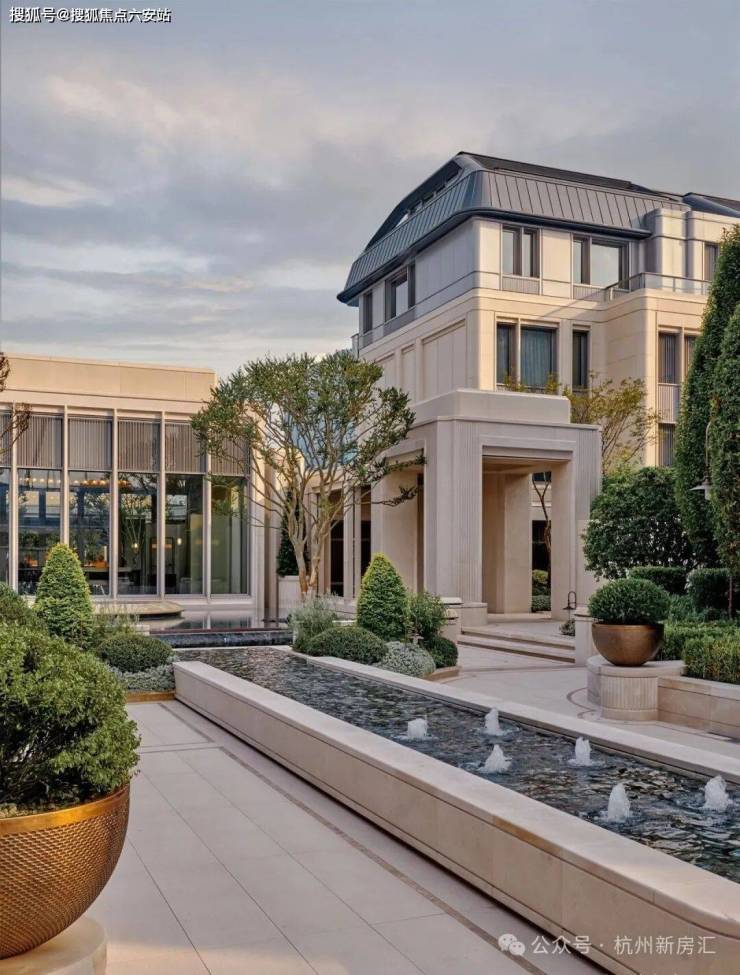 园林:中轴对称布局,移植70年紫薇、丹桂,镜面水池与蓝翡翠奢石水景营造法式宫廷感。