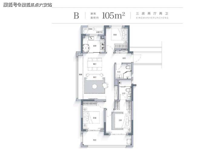 建筑面积约105方户型就设计出了备受年轻人喜爱的阔绰“横厅”,空间更加宽敞舒适。横厅的设计,让客餐厅融为一体,空间更开阔,增加了家庭聚会和娱乐的空间。