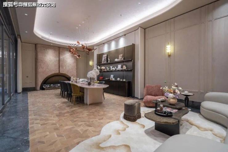 归家途中,穿过66米宽酒店式门楼,对植的名贵罗汉松与金属玻璃幕墙交相辉映,每一步都充满仪式感。园区内,棕榈树摇曳生姿,开放式酒廊与下沉卡座相映成趣,仿佛置身于热带度假胜地,让人忘却疲惫,尽享惬意时光。