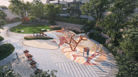 洋房则由代表谷雨的“破土出芽”雕塑开启,正面天桥,仪式感拉满;水盈则满,“小满”的水系喷泉,既诠释了节气的特色又把水景与建筑完美融合;夏至主题的“deer鹿 land”主题全年龄儿童乐园融合鹿角形态,人文与自然和谐统一。