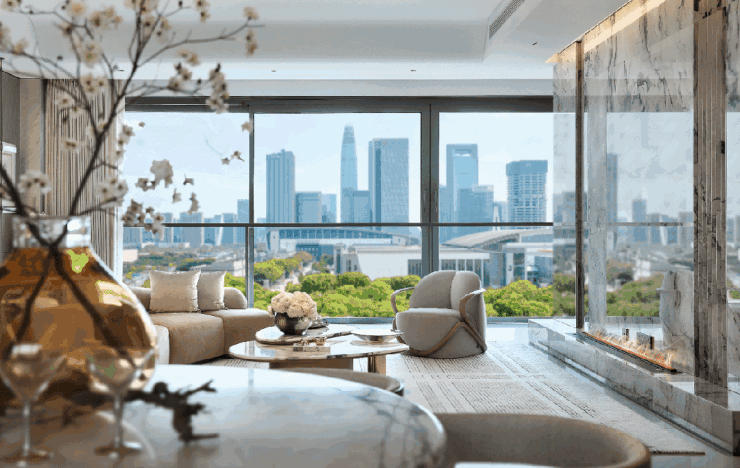 超大窗墙比:大面积玻璃与金属线条的碰撞,让室内采光通透无界,推窗即揽河景与天际线,实现“与自然共生”的居住体验;