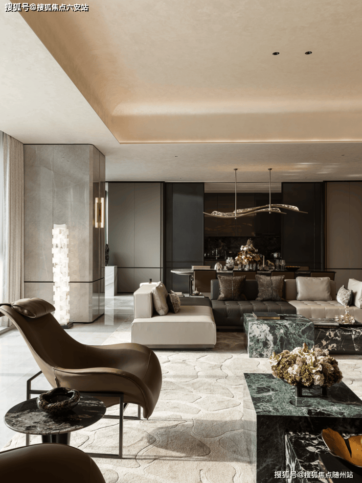 长桌石材深沉的纹理,在餐厅内映衬着波浪形吊灯,光影在金属与石面间流转。暮色下,餐椅围合出附有礼序的交流场域,光线沿着窗边柜体,映照出餐叙时刻的暖意。