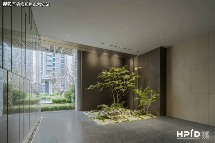 归家大堂的墙面采用了山形的自然肌理,不仅增加了空间的层次感,也让人感受到山间清新的气息。绿植的生机和墙面的山形肌理相互呼应,使空间显得更加完整和和谐,让归家大堂感觉有了凝聚力、吸引力和温度。