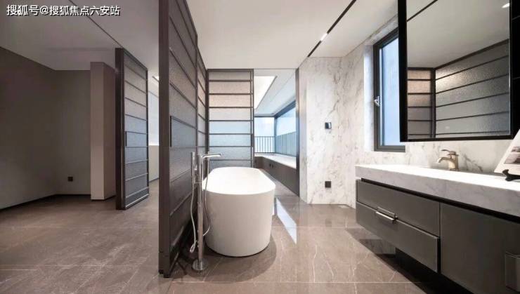 主卫不同于以往,采用了三分离的设计,另外还带有浴缸、双台盆,并且有完整的洄游动线,洗完澡后可以直接推开南面的移门。