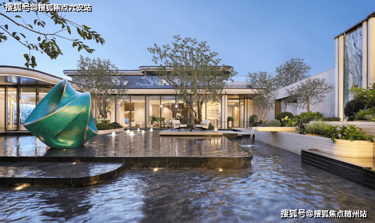 社区主入口的80米超宽幅门头,以7.1米高度树立仪式感。维多利亚绿奢石与白雪公主透光石的冷峻碰撞,贝金米黄石材的温润弧线,中央60年树龄紫薇树的祥瑞意蕴,共同构成一幅“紫气东来”的现代画卷。