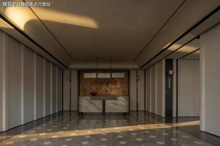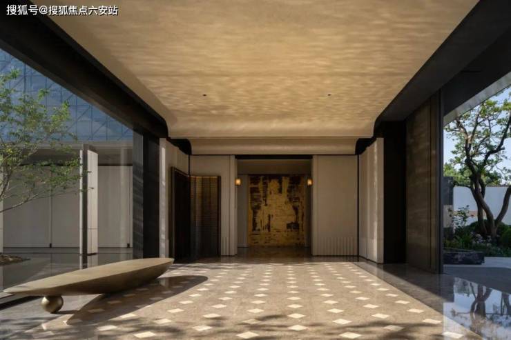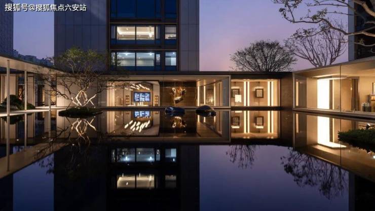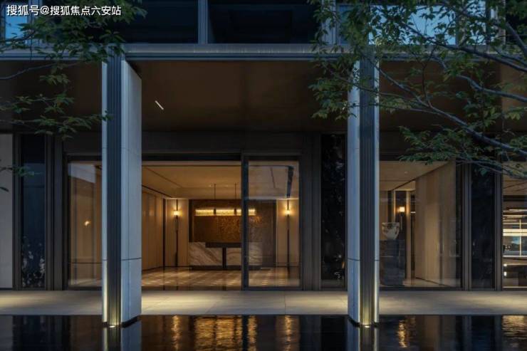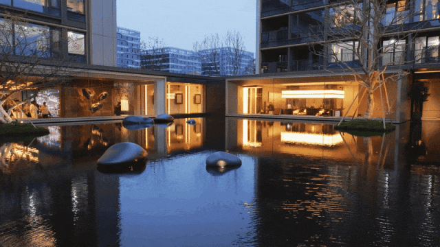 门前是同价位楼盘很少见的日本黑松,树龄有几十年。穿过主入口,迎接你的是美术馆般的巨幅玻璃框景。它框住的,是一座超300㎡的迎宾水院。水中摇曳着阵列的乔木,两岸是对称的连廊,扑面而来的仪式感,会让你想起新德里安缦酒店。