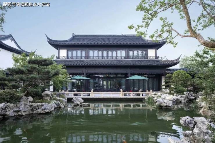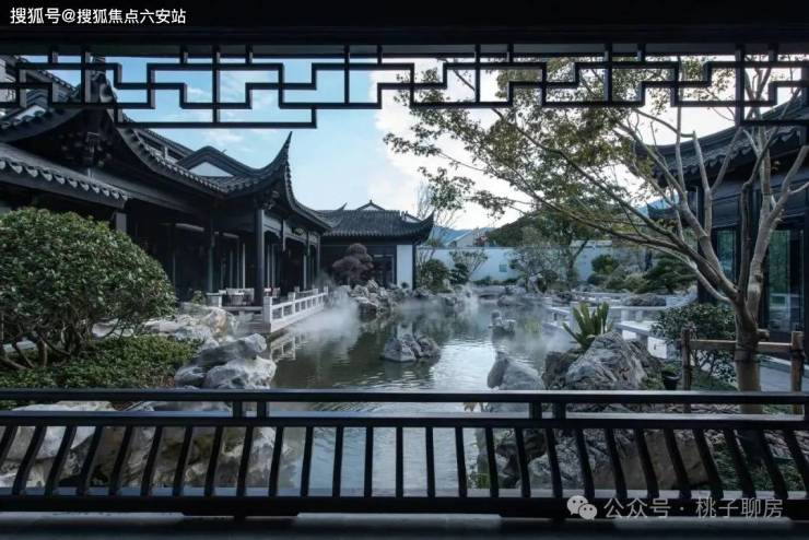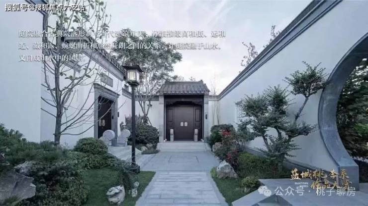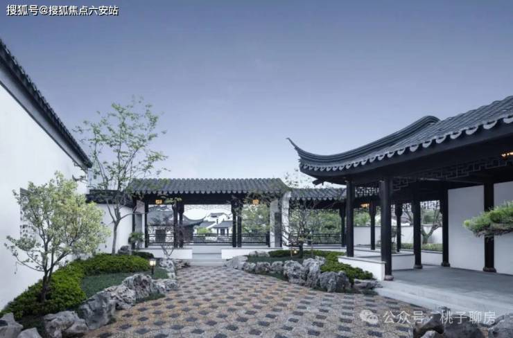 蓝城“桃李系”传承江南园林精髓,外立面白墙黛瓦+深咖铝板,复刻宋韵美学。