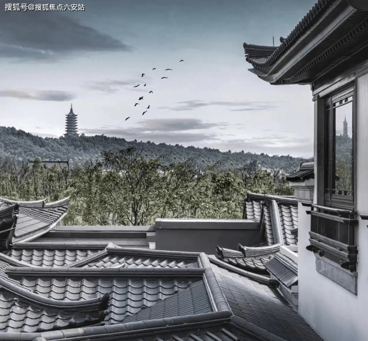 新中式建筑美学:灰墙黛瓦、飞檐翘角、对称布局,融合《富春山居图》意境,打造“可居可游”的东方雅韵
