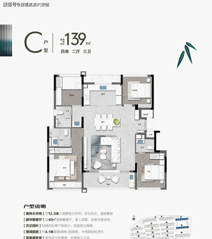 建面约139㎡实景样板房,经典四叶草户型设计,给家人更强的空间私密性及舒适感,让全家人的生活需求都能得到充分照顾。