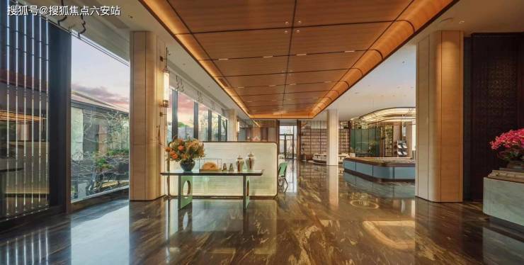 穿过景墙是下沉水院,连着售楼大厅和松林剧场,一边是水瀑潺潺,流淌成一幅古雅的宋韵山水画卷,一边是肆意舒展的罗汉松、老红梅、羽毛枫,铺展出悠远的东方意境。