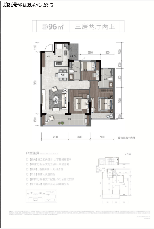 96㎡三房:边套设计,双开间朝南,独立玄关+干湿分离卫浴,总价友好。