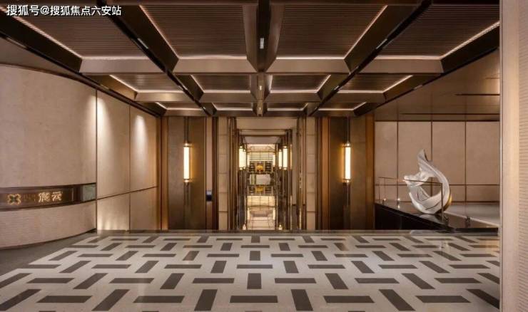 采用“王府中式”设计,大门为歇山顶形制(宽53米、高近11米),配黄铜狮、罗汉松及蓝翡翠奢石。园林融入西湖十景元素,如“花港观鱼”水景、“柳浪闻莺”绿植,并设雾森系统首层单元门厅石材铺就,肌理沉稳。