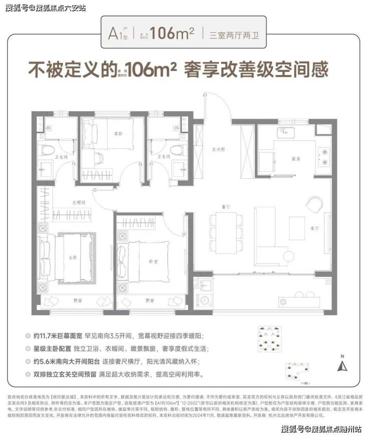 其中,建筑面积约106㎡的中间套户型,三房两厅两卫,有3.5开间朝南,面宽约11.7米,餐客厅外接约5.6米长的南阳台,让公区显得更为阔绰。