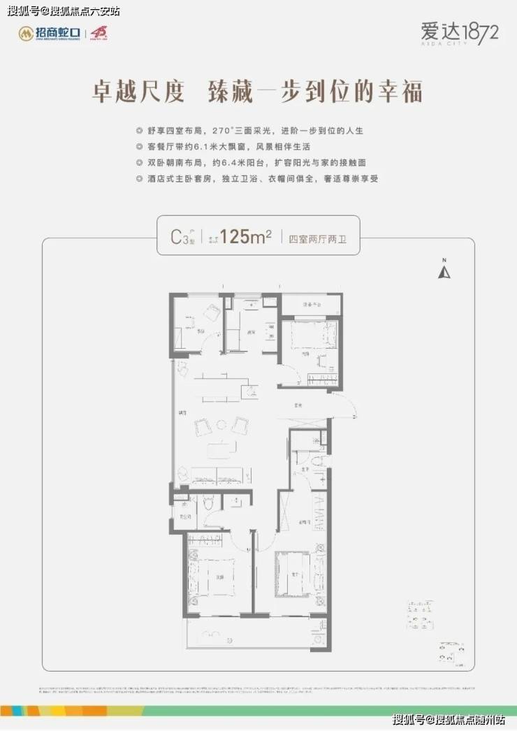 建筑面积约125㎡的户型,四房两厅两卫设计,是双卧朝南的边套户型,可以实现270°三面采光,餐客厅带约6,1米的大飘窗,更适合改善家庭居住。