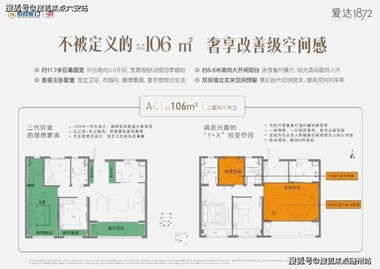 与常见的中间套户型不同,招商蛇口·爱达1872的建面约106㎡,南向有3.5开间,面宽约有11.7米。