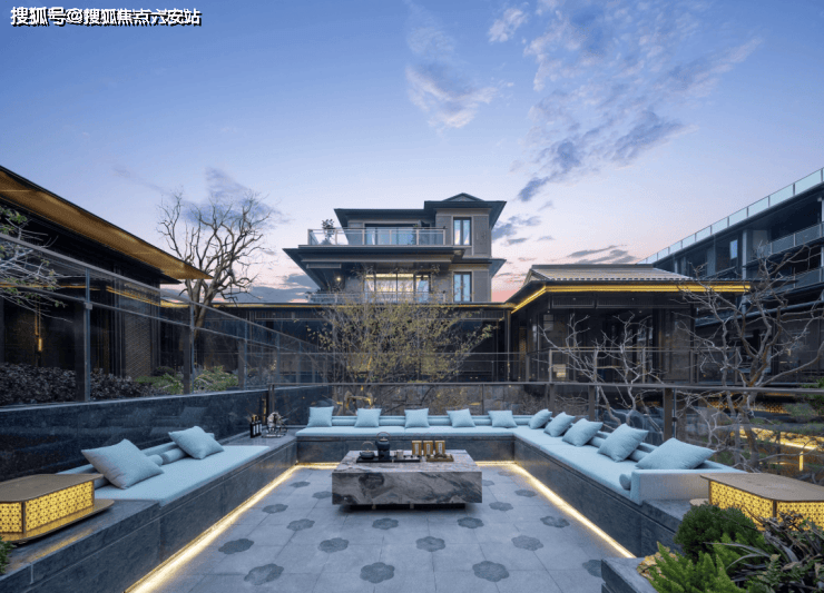 叠墅与合院采用蓝眼睛石材、铝板、玻璃幕墙等材质,搭配香槟金和古典灰,为建筑增加高贵、庄重的气质。歇山重檐、纳福悬鱼、黛墨青瓦、瘦金披檐等元素的点缀,将东方建筑之气韵、有形之光影完美融合。