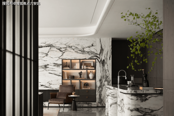 以320㎡户型为例,客餐厅及主卫地面、台面以 “鱼肚灰”铺陈留白,客厅背景墙及岛台则使用 “君子兰”,按照纹理延续进行拼接后,既似兰花又似泼墨山水,两者共同作用下,营造出中国山水画的意境。
