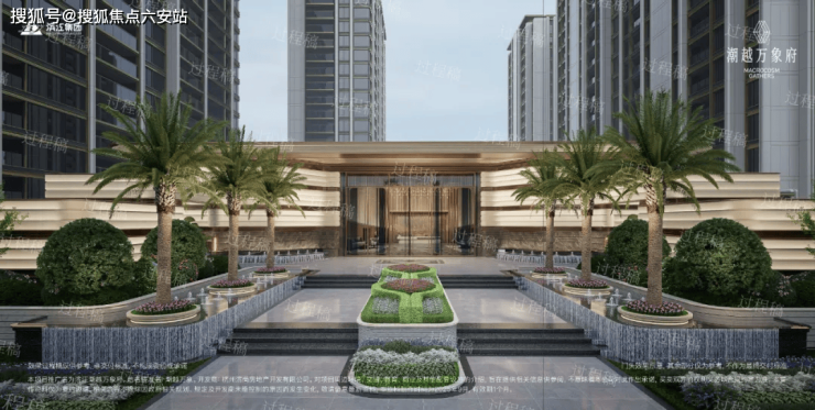 约37米棕榈树阵归家前场,下沉式庭院水幕疗愈;